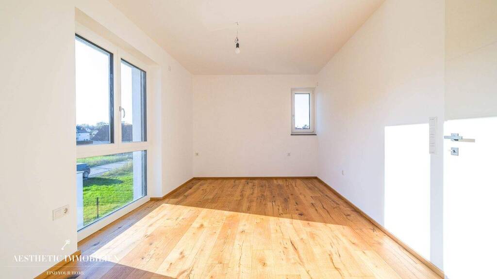 Die Ausstattung überzeugt mit Echtholzparkett, Fußbodenheizung über eine energieeffiziente Luftwärmepumpe und elektrischen Raffstores in allen Räumen - ideal für modernes und komfortables Wohnen.