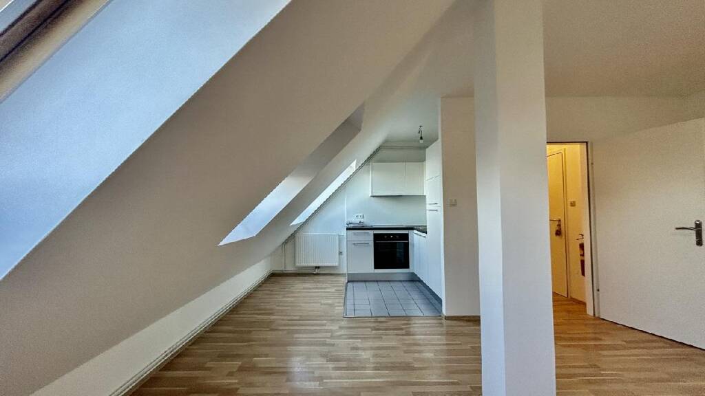 Im Dachgeschoss steht eine 2 Zimmer Wohnung mit einer Bruttomiete von € 1.162,35 Euro zur Verfügung. Sie bietet eine kleine, hochwertige Küche mit Markengeräten, darunter ein Siemens Geschirrspüler, sowie ein Badezimmer mit Wanne. Die vorhandenen Dachschrägen schaffen ein gemütliches Wohnambiente und richten sich an Personen, die diesen Wohnstil bewusst bevorzugen.