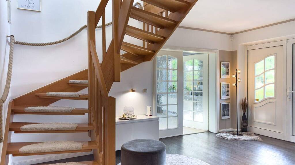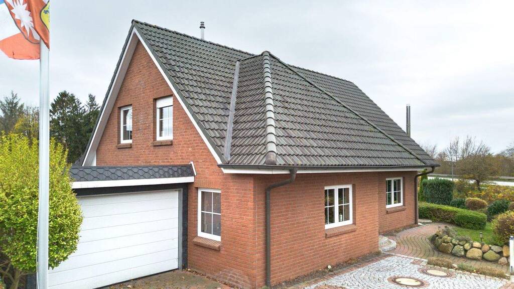 Dieses im Jahr 2000 in solider Bauweise errichtete Einfamilienhaus vereint durchdachte Architektur mit einem gepflegten, hochwertigen Wohnambiente. Perfekt zugeschnitten auf die Bedürfnisse einer Familie. Auf großzügigen ca. 152 m² Wohnfläche verteilen sich fünf gut proportionierte Zimmer sowie zwei moderne Bäder auf einem ca. 623 m² großen, pflegeleichten Grundstück. Beim Betreten des Hauses empfängt Sie ein großzügiger und repräsentativer Eingangsbereich, dessen Highlight die elegante Wendeltreppe aus Massivholz ist – ein wahrer Blickfang. Das lichtdurchflutete Herzstück des Hauses ist der offen gestaltete Wohn- und Essbereich. Hier schaffen großzügige Fensterflächen den ganzen Tag über eine helle, einladende Atmosphäre und bieten direkten Zugang in den grünen Garten. Die hochwertige Einbauküche aus dem Jahr 2019 präsentiert sich modern und funktional mit viel Stauraum und gepflegtem Erscheinungsbild. Ein weiteres Zimmer im Erdgeschoss – ideal als Gästezimmer oder ruhiges Homeoffice – bietet Zugang zur überdachten Terrasse. Ein praktischer Hauswirtschaftsraum mit Einbauten ist direkt von der Garage aus erreichbar. Ergänzt wird diese Ebene durch ein Duschbad mit Tageslicht. Im Obergeschoss erwarten Sie die privaten Rückzugsorte. Das Schlafzimmer profitiert von einem angeschlossenen Ankleidezimmer sowie dem geräumigen Vollbad mit Wanne und Dusche, welches auch vom Flur aus erreichbar ist. Der Flurbereich wird aktuell als flexibler Büroarbeitsplatz genutzt. Zwei zusätzliche Zimmer bieten vielfältige Nutzungsmöglichkeiten, etwa als Kinderzimmer mit Platz zum Spielen und Wachsen. Das Grundstück überzeugt durch seine klare Gestaltung und die überdachte Terrasse in Südostausrichtung – ein geschützter Platz für entspannte Stunden im Freien. Ein separater Geräteschuppen schafft zusätzlichen Stauraum. Zur Ausstattung gehören zudem Fußbodenheizungen in den Bädern, Jalousien an allen Fenstern und Schallschutzfenster zur Straßenseite. Eine geräumige Garage mit Fensterflächen und direktem Zugang in den Garten sowie zwei Stellplätze ergänzen das attraktive Gesamtbild.