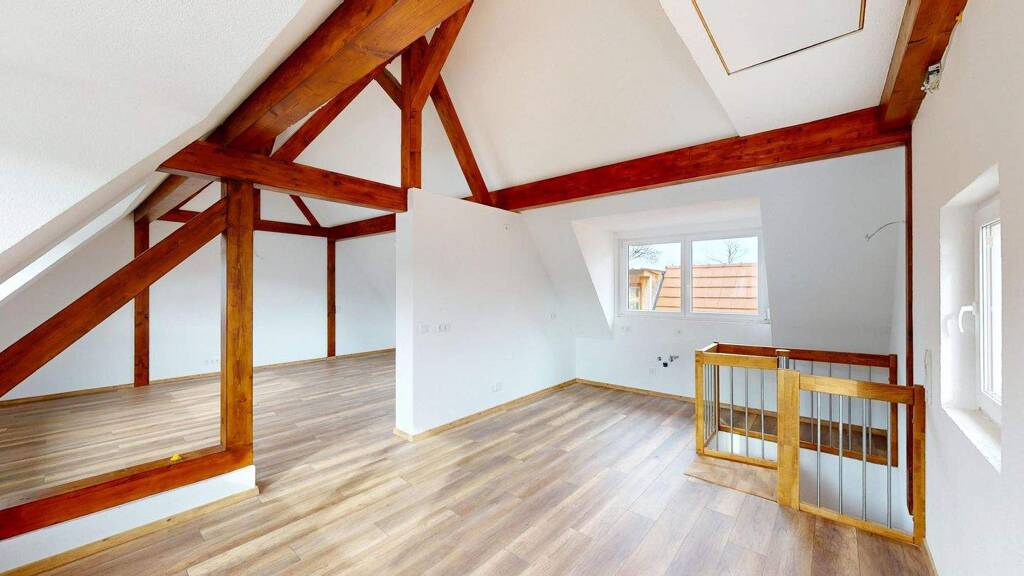 Den Mittelpunkt des Hauses bildet das ausgebaute Dachgeschoss. Hier befinden sich das Wohn- und Esszimmer sowie der Küchenbereich. Eine Küche ist noch nicht eingebaut, die erforderlichen Anschlüsse sind jedoch bereits verlegt. Sichtbare Holzbalken verleihen dem Raum Charakter und Wärme, während vier neu eingebaute Gauben für viel Tageslicht und ein luftiges Raumgefühl sorgen. Die massive Treppe aus Buchenholz unterstreicht die wertige Ausführung.