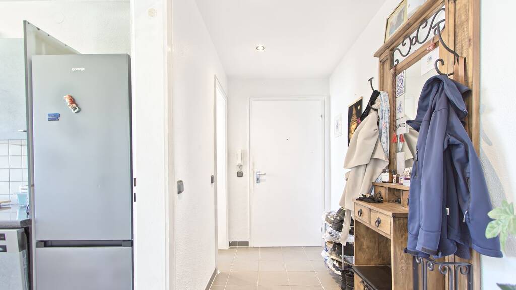 Helle Oberflächen, weiße Innentüren und moderne Einbauspots in Flur und Badezimmer verleihen der Wohnung ein freundliches, harmonisches Ambiente. In den Lauf- und Nutzbereichen sind pflegeleichte Fliesen verlegt, während der Wohn- und Schlafbereich mit ansprechendem Laminatboden eine warme Wohnatmosphäre schafft. Das Tageslichtbad verfügt über eine Badewanne und präsentiert sich in sehr gepflegtem Zustand. Der nach Osten ausgerichtete, windgeschützte Balkon bietet einen angenehmen Rückzugsort im Freien.