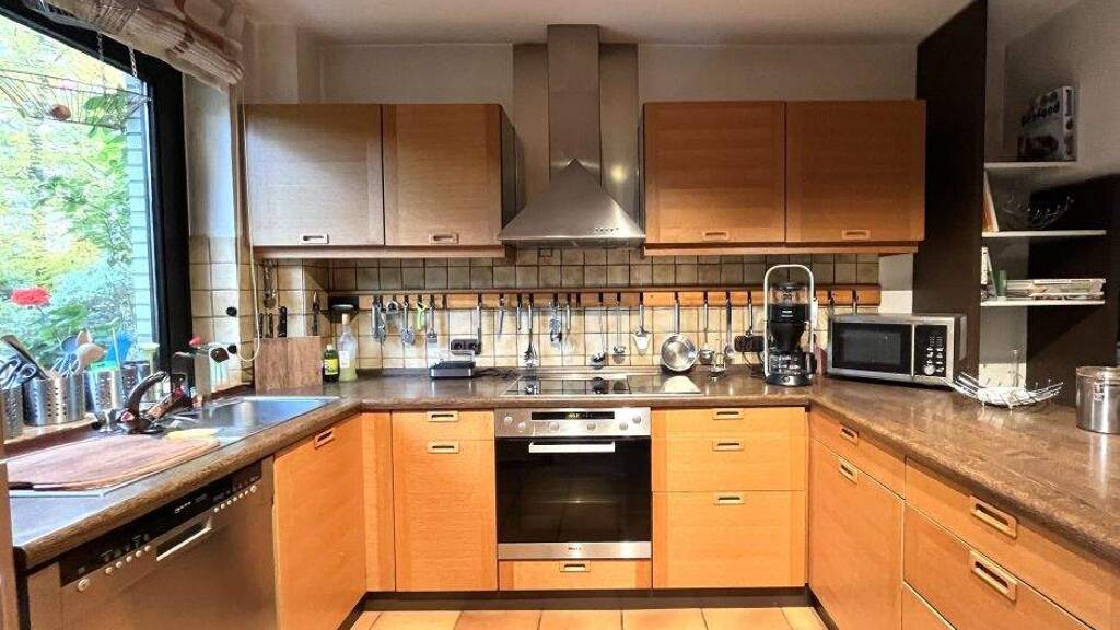 Die Küche ist zur Wohnebene aufgebrochen und erlaubt den Blick in den Mittelpunkt der Immobilie und den Garten.