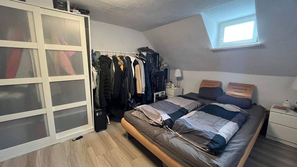 Über eine Treppe gelangt man in das obere Geschoss, das als ruhiger Rückzugsbereich dient. Hier befinden sich das Schlafzimmer sowie eine kleine, praktische Büronische, die sich ideal für Homeoffice oder als Arbeitsbereich eignet.