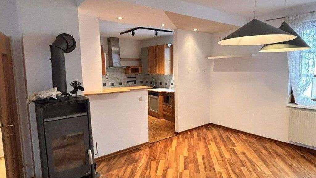 Zusätzlich zur Gasheizung befindet sich im offenen Wohn-/Esszimmer ein Schwedenofen, mit dem die Wohnung geheizt werden kann.