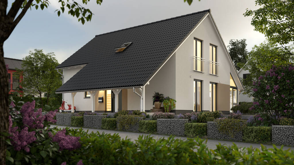 Das großzügige Haus mit dem schönen Satteldach überzeugt mit viel Platz und einem variablen Grundriss. Das Wohnzimmer schenkt genügend Raum zur Erholung, die sich anfügende Essecke wird schnell zum gemütlichen Familienmittelpunkt mit direktem Zugang zur Küche. Die hohen Fenster fangen das Tageslicht besonders gut ein. Jeder Raum im Haus wirkt offen und freundlich. Ein Arbeits- oder Kinderzimmer und das Gäste-WC runden das Erdgeschoss perfekt ab.