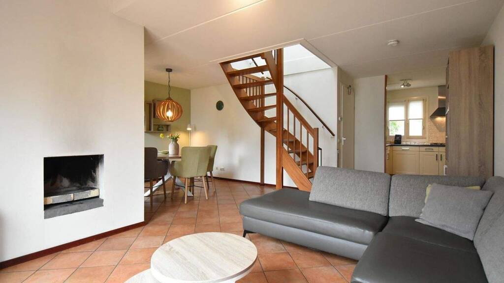 Das stilvolle Wohnzimmer bildet das Herz dieses mediterranen Eckhauses mit einem grauen Ecksofa, das bequem Platz für die ganze Familie bietet. Die auffällige orange Akzentwand schafft Wärme und Charakter, während das wunderschöne Blumenfelder-Gemälde die Verbindung zur Bollenstreek betont. Der Terrakotta-Boden verstärkt die mediterrane Ausstrahlung und sorgt für zeitlose Eleganz. Große Fenster bieten viel natürliches Licht und Blick auf die grüne Parkumgebung. Die Terrassentüren schaffen eine nahtlose Innen-Außen-Verbindung, perfekt um die niederländischen Sommer zu genießen. Die charakteristische Holztreppe zur ersten Etage bildet einen architektonischen Höhepunkt. Dieses Wohnzimmer bietet die ideale Kulisse für Entspannung und Geselligkeit während Ihres Urlaubs im Duinresort Dunimar.
