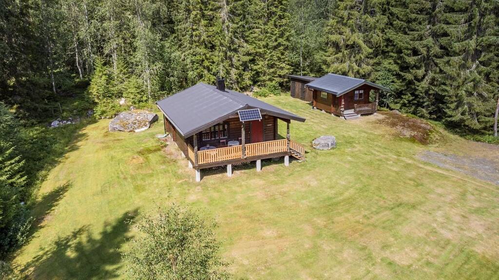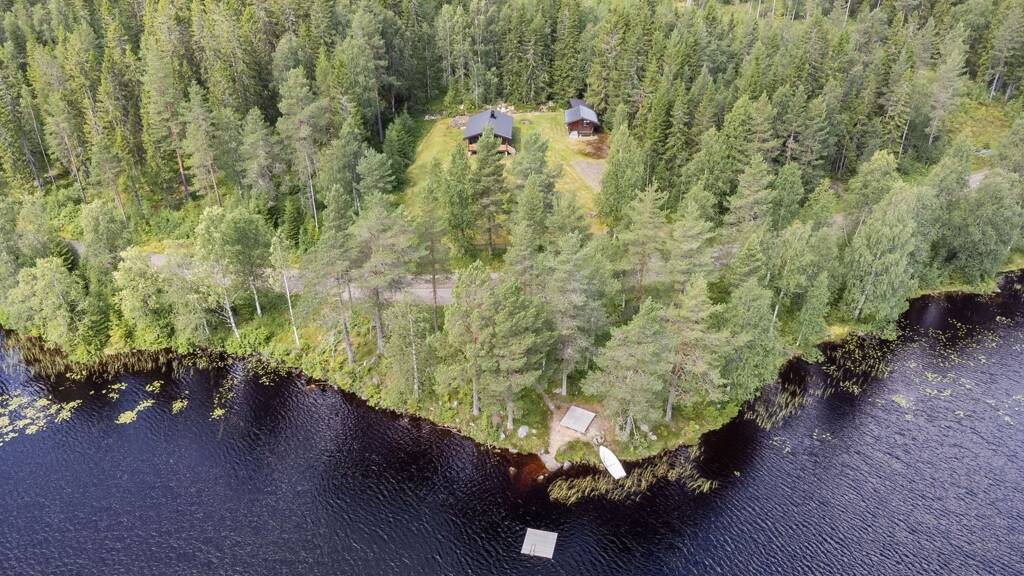 Auf der kleinen Waldlichtung sammeln sich das winterfeste Blockhaus, ein Gästehaus und ein Schuppen, aufgeteilt in einen Zugang zur Außentoilette und einen Zugang zum Geräte- und Holzlager.