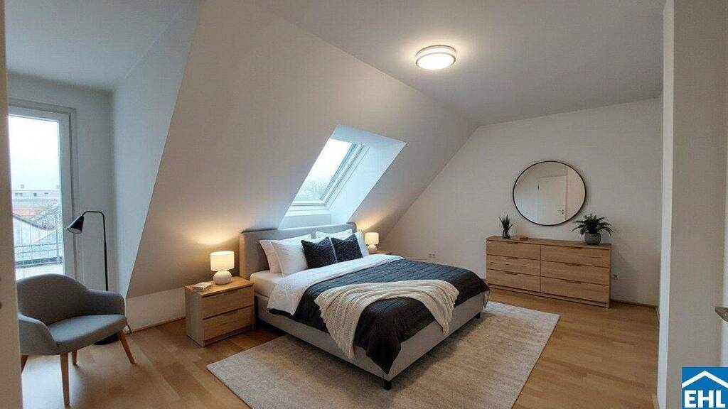 Die Wohnung selbst befindet sich im 1. Dachgeschoß und verfügt über eine Wohnküche, zwei Schlafzimmer, ein Badezimmer mit Dusche, WC und Waschmaschinenanschluss, ein separates WC, sowie einen Vorraum. Zwei Balkone runden das Wohnerlebnis ab.