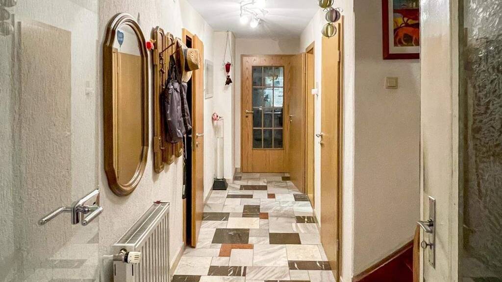 Dieses Einfamilienhaus bietet ein großzügiges Raumangebot und befindet sich in einer ruhigen Siedlung mit Blick ins Grüne. Das Haus wurde 1964 errichtet und 1972 durch einen Anbau erweitert. Es erstreckt sich über drei Etagen und verfügt über insgesamt rund 10 Zimmer. Im Erdgeschoss gelangen Sie vom Wohnzimmer aus auf die Gartenterrasse. Der freie Blick in die angrenzende Natur bietet gute Voraussetzungen für Aufenthalte im Außenbereich. Darüber hinaus stehen auf dieser Etage vier weitere Räume, zwei separate WCs, eine kleine Küche sowie ein Abstellraum zur Verfügung. Das Kellergeschoss umfasst neben der größeren Küche - wie auch im Grundriss ersichtlich - zwei Tageslichtbäder, ausgestattet mit Badewanne und Dusche. Außerdem befinden sich hier ein Arbeitszimmer, ein Wohn- bzw. Esszimmer sowie weitere Nutz- und Abstellflächen, darunter ein Vorratsraum, der Heizungsraum und Lagerräume. Eine Garage direkt am Haus bietet einen überdachten Stellplatz. Im Obergeschoss befinden sich zudem drei Schlafzimmer sowie ein Abstellraum, der auch als Ausbaureserve genutzt werden kann. Der Dachboden bietet zusätzlichen Stauraum. In den vergangenen Jahren wurden verschiedene Modernisierungen durchgeführt: Das Dach wurde 2012 erneuert, die Fenster wurden 1995 ausgetauscht und die Elektrik ebenfalls 1995 auf den damaligen Stand gebracht. Die Beheizung erfolgt über eine Öl-Zentralheizung aus dem Jahr 1992. Die Abwasserentsorgung erfolgt teils über eine Klärgrube und teils über die zentrale Kanalisation. Durch die vielseitige Raumaufteilung und die bereits vorgenommenen Maßnahmen ergeben sich unterschiedliche Nutzungsmöglichkeiten, beispielsweise als Einfamilienhaus, Mehrgenerationenhaus oder in Verbindung von Wohnen und Gewerbe.