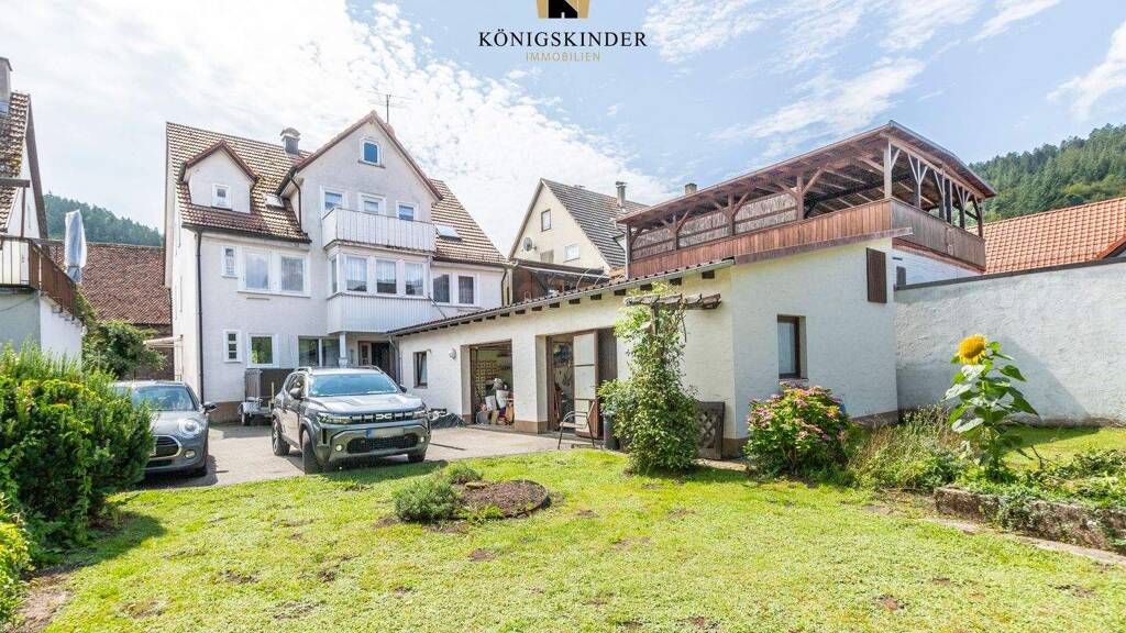 Auf einem großzügigen Grundstück von 516?m² präsentiert sich dieses Wohn- und Geschäftshaus mit vielseitigen Nutzungsmöglichkeiten. Es umfasst zwei separate Wohneinheiten, eine vermietete Gewerbefläche im Erdgeschoss sowie eine praktische Werkstatt im Hinterhof. In den 1960er-Jahren umfassend saniert und 1994 mit neuem Dach und erneuerter Fassade ausgestattet, bietet das Gebäude eine solide Basis für die Zukunft. Im geschützten Innenhof stehen zwei Garagen und zwei Stellplätze zur Verfügung; von hier aus erreichen Sie auch die Werkstatt. Der sonnige Garten grenzt direkt an den Flößerwasen und eröffnet einen herrlichen Blick in Richtung Schwarzwald. Noch eindrucksvoller ist die Aussicht vom Balkon - hier schweift der Blick über das Jagdschloss und die Klosterruine Hirsau bis hin zur Marienkapelle.