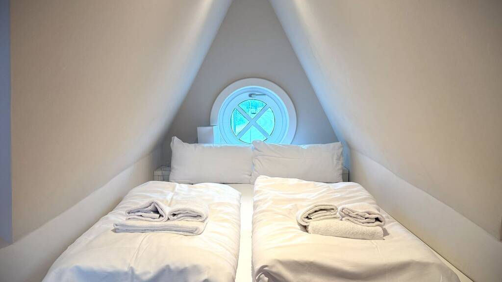 Der Spitzboden ist ebenfalls maßangefertigt ausgebaut, verfügt über zwei Fenster und bietet ausreichend Platz zur individuellen Nutzung.