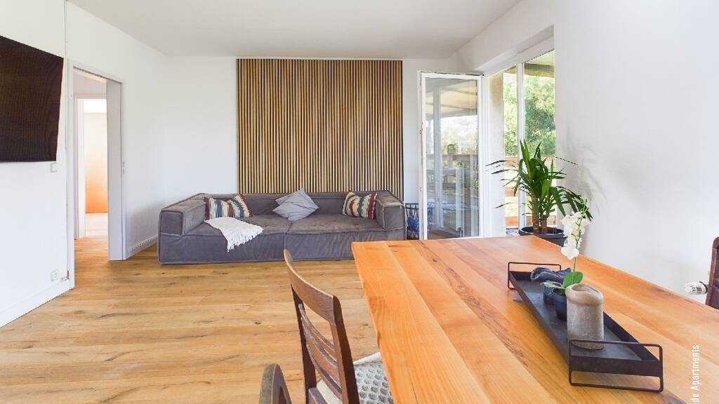Im hellen, geräumigen Wohnzimmer warten eine Sofalandschaft und ein großer Fernseher auf Sie und Ihren Feierabend. Zum Apartment gehören weiterhin zwei Schlafzimmer und ein Wannenbad.