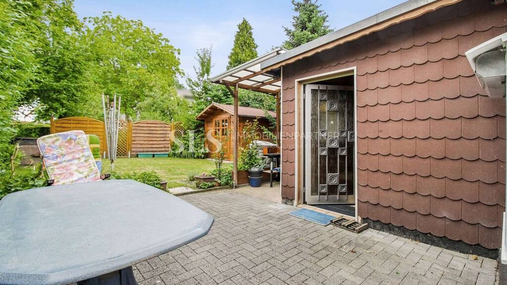 Der Gartenbereich wurde mit viel Liebe zum Detail gestaltet und bietet eine angenehme Rückzugsoase. Eine praktische Gartenhütte dient nicht nur zur Aufbewahrung von Gartenmöbeln, sondern eignet sich auch hervorragend als kleiner Treffpunkt für gesellige Stunden im Freien.