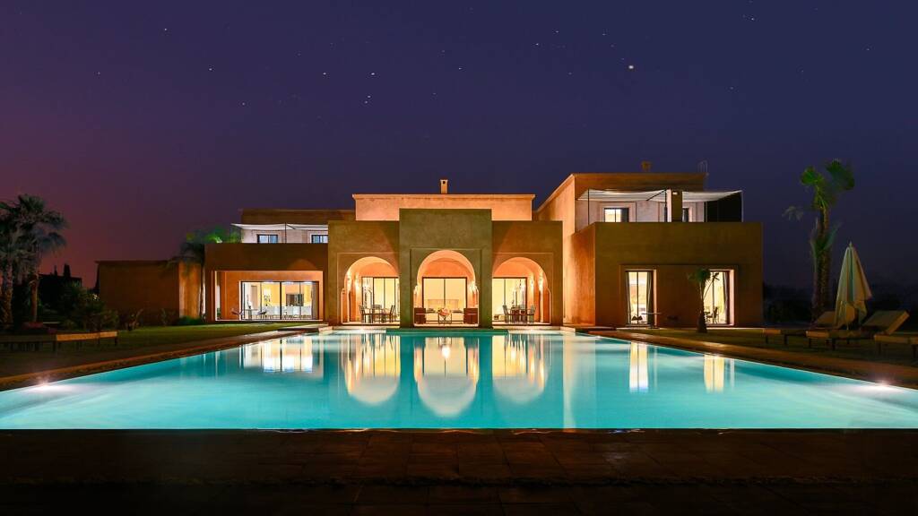 VILLA L'ALBAÏCIN, this 1700 m² luxury villa and its 6 impressive suites (sleeps 12+3) is ideally located 20 minutes south of the centre of Marrakech. The villa boasts a contemporary Arab-Andalusian design by one of Morocco's leading architects. With a view of the Atlas Mountains and surrounded by a beautifully landscaped 17000 m² garden.