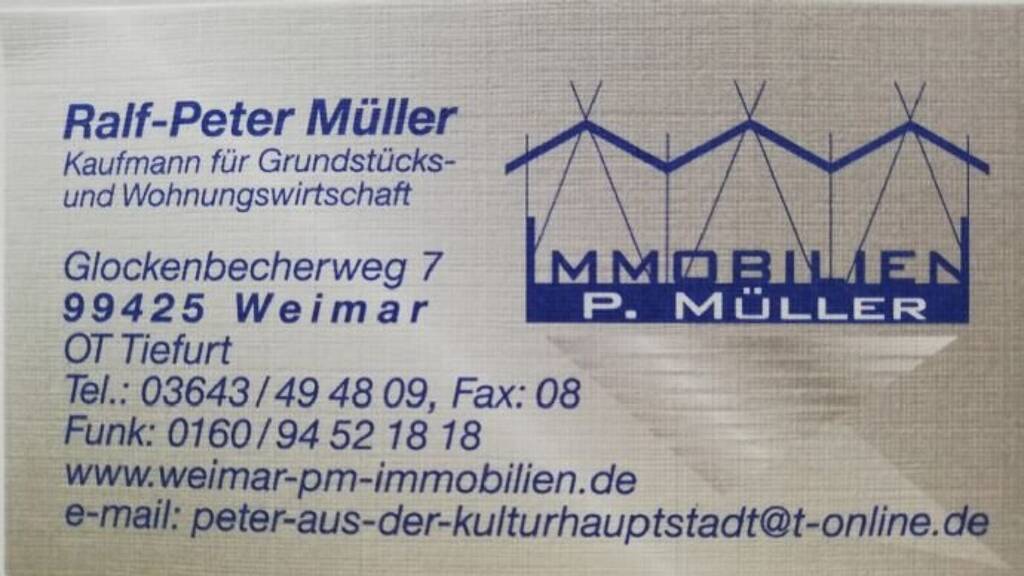Hinweis Alle Angaben sind ohne Gewähr und basieren ausschließlich auf Informationen, die uns von unserem Auftraggeber übermittelt wurden. Wir übernehmen keine Gewähr für die Vollständigkeit, Richtigkeit und Aktualität dieser Angaben. Irrtum und Zwischenverkauf vorbehalten. Auf Wunsch stehen wir Ihnen mit weiteren Informationen zum Objekt und zum Eigentümer gerne zur Verfügung. Die Besichtigung kann jederzeit nach Vereinbarung mit einem unserer Mitarbeiter/Beauftragten erfolgen. An dieser Stelle weisen wir noch einmal ausdrücklich auf unsere Allgemeinen Geschäftsbedingungen hin. Maklervertrag Der Maklervertrag kommt mit uns entweder durch schriftliche Vereinbarung oder auch durch die Inanspruchnahme unserer Maklertätigkeit auf der Basis des Objekt-Exposees und seiner Bedingungen zustande. Sollte das von uns nachgewiesene Objekt bereits bekannt sein, teilen Sie uns dieses bitte unverzüglich mit. Die Käuferprovision ist 3,57% inklusive der gesetzliche MwSt. von 19% und ist nach dem notariellen Vertragsabschluss fällig und zu diesem Zeitpunkt von dem Käufer an die Fa. PM-Immobilien in 99425 Weimar OT Tiefurt, Glockenbecherweg 7, zu zahlen. Geldwäschegesetz Gemäß § 2 Absatz 1 Nr. 10 GwG ist die Fa. PM-Immobilien mit Sitz in 99425 Weimar OT Tiefurt, Glockenbecherweg 7 als Makler verpflichtet, die Identität der Kunden bei Kontaktaufnahme festzustellen. Zu diesem Zweck bitten wir Sie um Verständnis, dass wir Ihre persönlichen Daten (Name, Anschrift, Geburtsdatum, Geburtsort und Nationalität) vor Anbahnung einer Geschäftsbeziehung zu erheben haben. Dies erfolgt mittels einer Kopie Ihres Personalausweises sowie bei Firmen und juristischen Personen über einen aktuellen Handelsregisterauszug. Diese Unterlagen werden selbstverständlich vertraulich behandelt. Wir bitten um Ihr Verständnis,