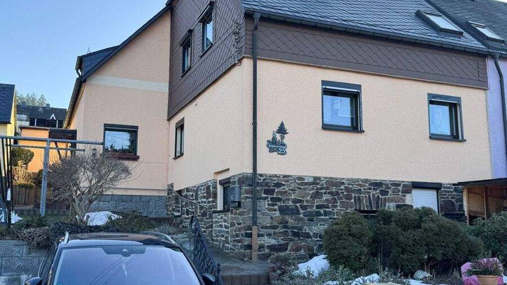 Sie sind auf der Suche nach Ihren eigenen vier Wänden ohne großen Bauaufwand? Diese großzügige Doppelhaushälfte liegt in beliebter Lage von Beierfeld und verbindet idyllische und ruhige Lage mit städtischer Nähe! Das im Jahre 1938 erbaute Objekt wurde um 1972 mit einem Anbau erweitert und bietet eine Gesamtfläche von ca. 142,50 m². Das Objekt wurde Anfang der 1990er Jahre grundhaft saniert, so wurde eine Gas-Zentralheizung Viessmann im Jahre 2013 eingebaut, die Elektrik & Wasserleitungen erneuert sowie Thermofenster Kunststoff doppelt verglast eingesetzt, bis 2015 wurde eine grundhafte Renovierung des Anbaus vorgenommen. Zur Aufteilung: Durch den Haupteingang betreten Sie das 1. Treppenhaus (Anbau). Von hier gelangen Sie in das ruhige Schlafzimmer im OG sowie ein Kinderzimmer und ein kleines Abstellzimmer. Im EG steht Ihnen ein Esszimmer, der Zugang zum Keller sowie die Küche zur Verfügung. Von hier gelangen Sie in das 2. Treppenhaus (Altbestand), welches auch durch die Hintertür vom Garten erreichbar ist. Hier finden Sie das großzügige Wohnzimmer mit Kamin im EG, sowie ein Gäste-WC. Im Obergeschoss stehen Ihnen 2 weitere große Schlafzimmer zur Verfügung. Ebenfalls erreichen Sie von hier den Dachboden und den Keller. Im Keller befinden sich die beiden Hauptbäder mit jeweils Badewanne & Dusche sowie die Waschküche und zahlreiche Abstellmöglichkeiten. Der großzügige Garten befindet sich in Hanglage und verfügt über ein großes Gartenhäuschen sowie eine hübsche Finn-Hütte mit Grillplatz & Fischteich.