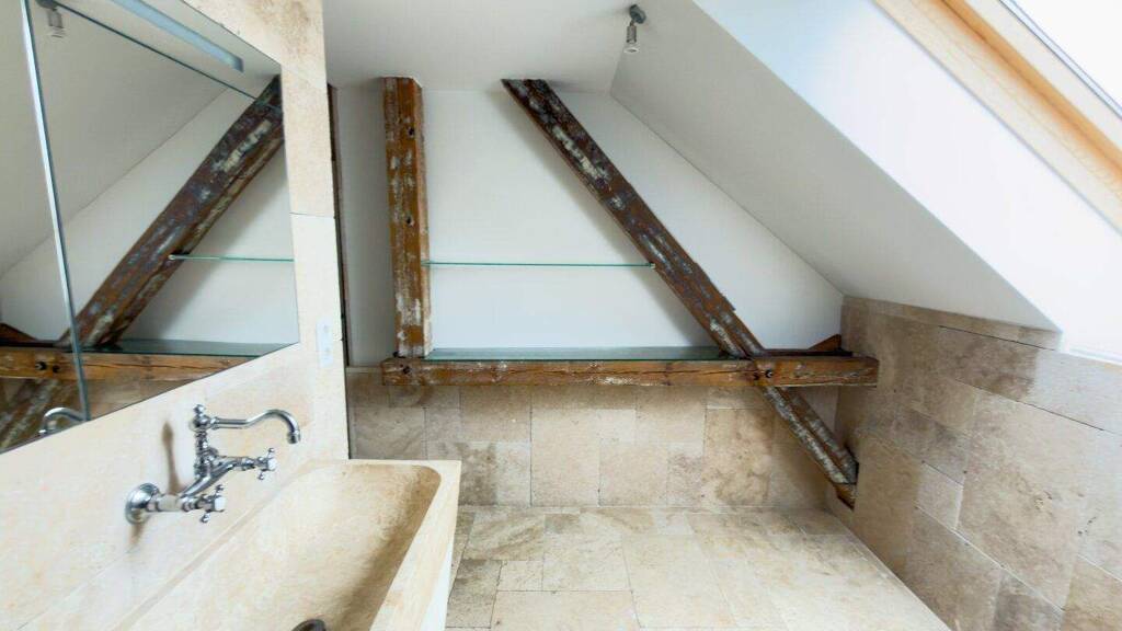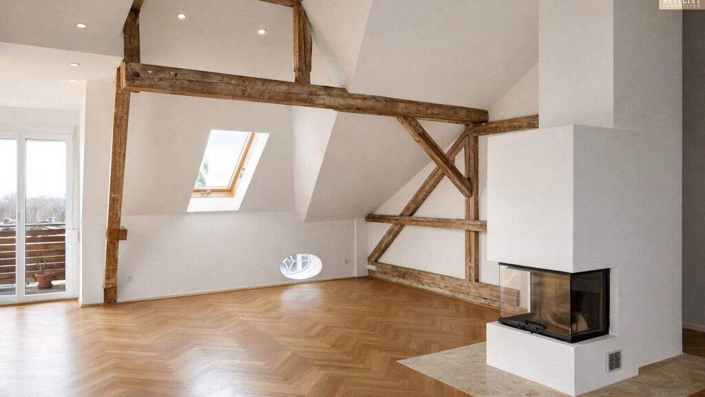 Die offene L-Form, eine Raumhöhe von über 4 Metern, sichtbare historische Dachbalken sowie Fischgrätparkett aus Eichenholz schaffen ein außergewöhnlich repräsentatives Wohnambiente.