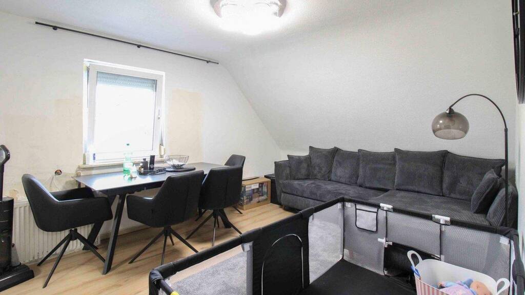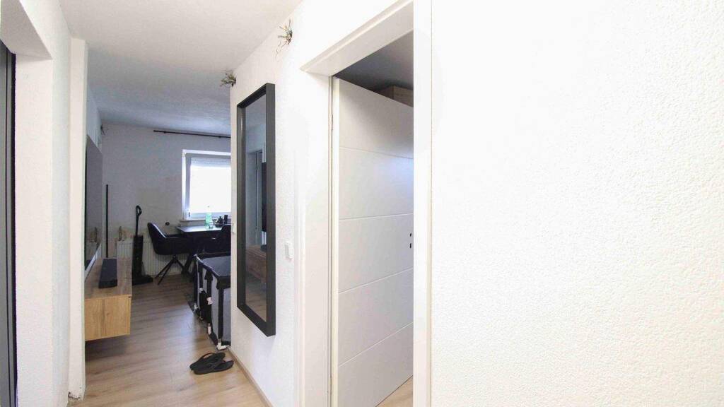 Neben einem hellen Wohnzimmer stehen drei weitere Zimmer zur Verfügung, die sich flexibel als Schlaf-, Kinder- oder Arbeitszimmer nutzen lassen. Ein zentraler Flur verbindet alle Räume. Das Badezimmer ist mit einer Dusche ausgestattet und wurde im Jahr 2025 neu gefliest.