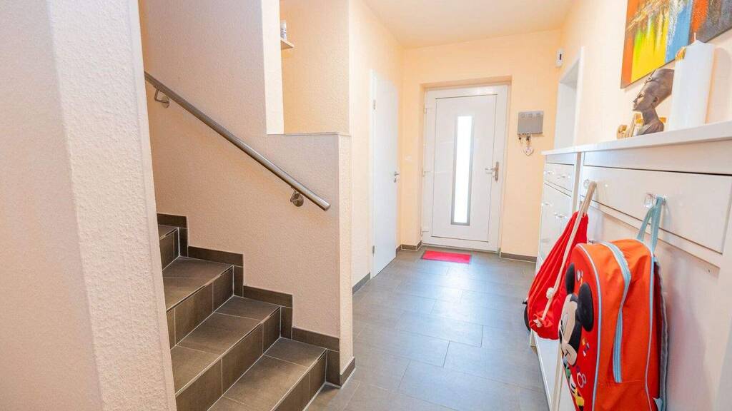 Diese moderne Doppelhaushälfte aus dem Jahr 2020 überzeugt auf ca. 125?m² Wohnfläche mit einem durchdachten und familienfreundlichen 4-Zimmer-Grundriss. Beim Betreten der Wohneinheit gelangen Sie in einen einladenden Eingangsbereich von ca. 9?m², der über eine praktische Garderobennische verfügt. Von hier aus erreichen Sie das Gäste-WC mit ca. 2?m², den Hauswirtschaftsraum mit ca. 7?m² sowie eine Abstellkammer unter der Treppe mit ca. 2?m², die zusätzlichen Stauraum für Haushaltsutensilien bietet.