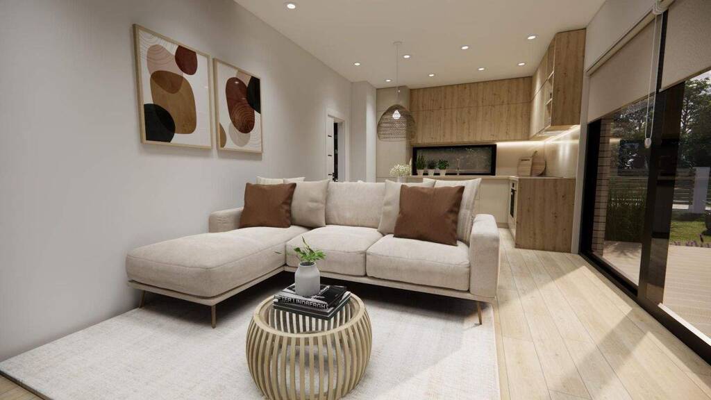 Die durchdachte Planung umfasst einen Eingang mit Flur, ein helles Wohnzimmer mit Küchenzeile, ein funktionales Badezimmer sowie ein gemütliches Schlafzimmer. So entsteht ein angenehmes Wohnambiente, das Komfort, Praktikabilität und Gemütlichkeit perfekt verbindet.