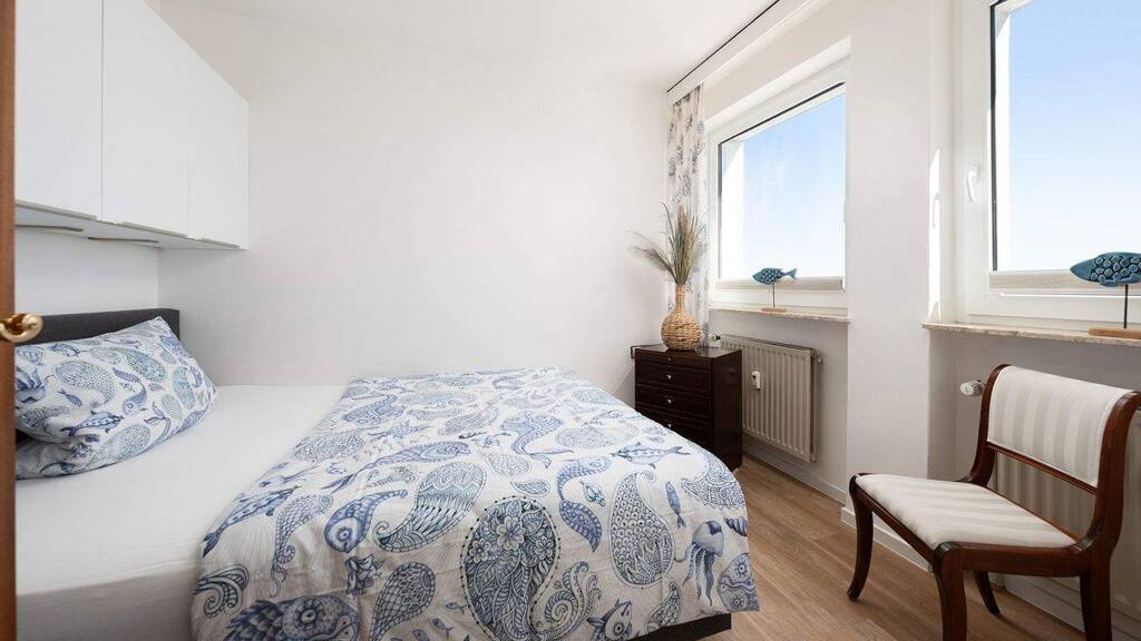 Die großzügig gestaltete Wohnung besticht durch einen offenen Wohn- und Essbereich, eine voll ausgestattete, moderne Einbauküche sowie zwei separaten Schlafbereichen. Das Badezimmer mit Dusche ist modern und stilvoll gestaltet. Bodentiefe Fenster sorgen für lichtdurchflutete Räume und eine beeindruckende Aussicht. Die großzügige Dachterrasse mit hochwertigen Fliesen lädt zum Entspannen ein und bietet eine einmalige Kulisse für erholsame Stunden mit Blick auf das Meer.