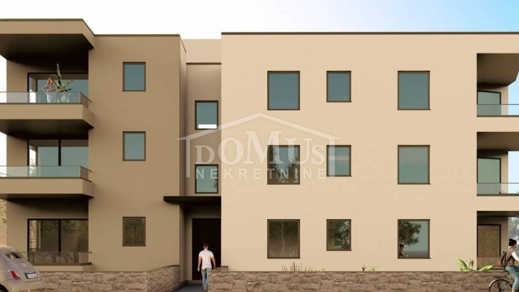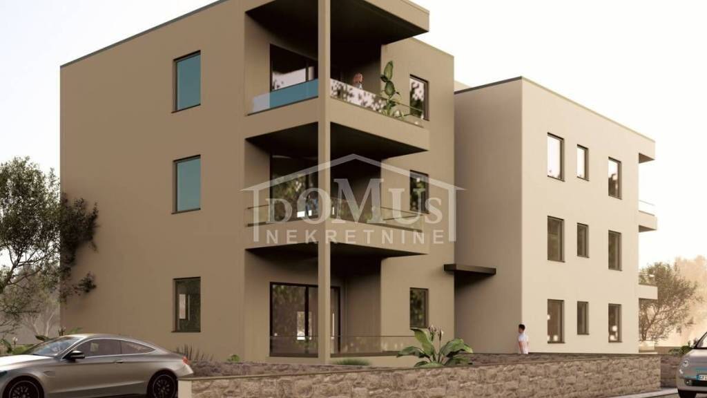 Tribunj - Neubau, ein Mehrfamilienhaus mit 9 Wohneinheiten. Das Gebäude bietet einen Panoramablick auf das Meer und besteht aus vier Etagen: Untergeschoss + Erdgeschoss + 1. Stock + 2. Stock. Das Gebäude hat ein modernes Design und wird mit hochwertigen Bodenbelägen, Innen- und Außenholzarbeiten, Klimaanlagen zum Heizen und Kühlen in jedem Raum sowie elektrischen Rollladenantrieben ausgestattet. Jede Wohneinheit verfügt über einen eigenen Parkplatz und einen Abstellraum im Untergeschoss. Das Gebäude liegt nur 700 m vom Strand Bristak und 950 m vom Zentrum sowie allen wichtigen Einrichtungen entfernt. Der voraussichtliche Einzugstermin ist Ende 2026.
