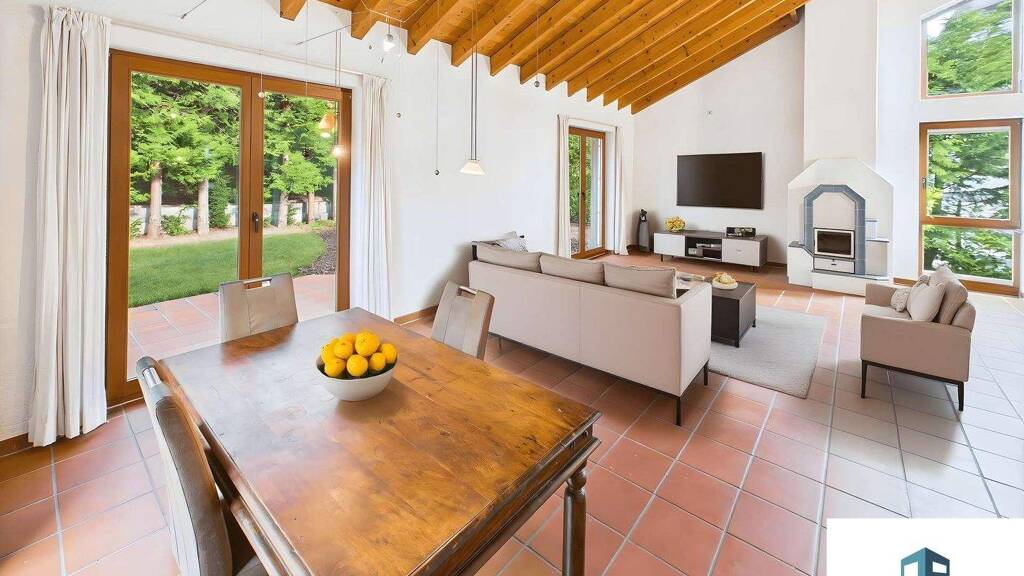 Im oberen Stockwerk beeindruckt der weitläufige Wohn-Essbereich, der durch seine großflächigen Fenster, offene Holzbalkendecken und dem markanten Kaminofen sofort begeistert. Die Raumhöhe, das natürliche Lichtspiel und die Materialwahl verleihen diesem Herzstück des Hauses eine ganz besondere Wirkung.