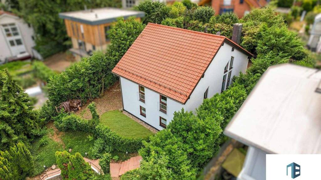 Dieses außergewöhnliche Einfamilienhaus vereint architektonische Raffinesse mit einem durchdachten Grundriss und einer Atmosphäre, die vom ersten Moment an Geborgenheit und Weite vermittelt. Mit rund 193?m² Wohnfläche auf einem 779?m² großen Grundstück, bietet es reichlich Raum für Familienleben, Rückzug und kreative Entfaltung. Ob der großzügige Wohn-Essbereich mit Kamin und hohen Decken, die beliebte Empore im Kinderzimmer, das helle Studio im Dachgeschoss oder der idyllische Garten mit Terrasse - hier lebt man nicht nur, hier fühlt man sich zuhause.