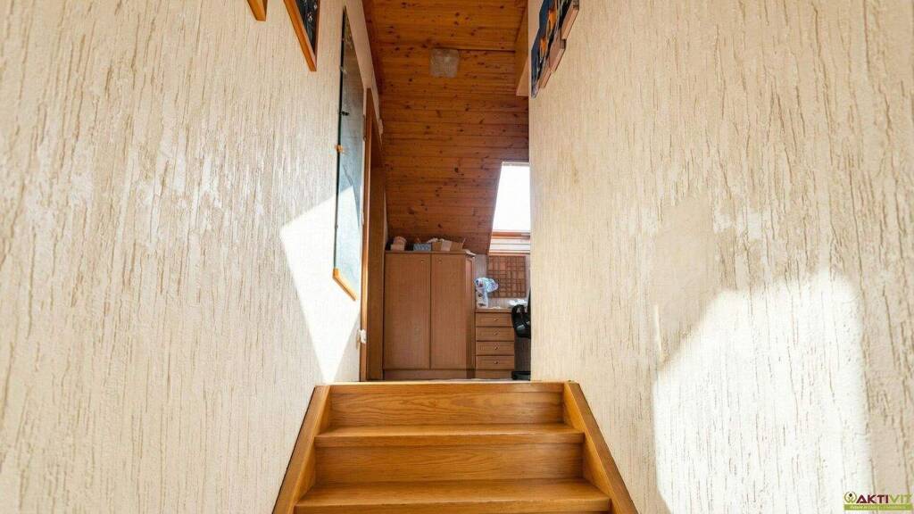 Im Erdgeschoss gelangt man über einen kurzen äußeren Stufenanstieg in den Vorraum. Dieser bildet einen zentralen Gang, von dem aus die Räume auf dieser Ebene erschlossen werden. Zur linken Seite befinden sich ein WC und ein Abstellraum, zur rechten Seite das Treppenhaus mit Verbindung in den Keller und in das Dachgeschoss. Weiters erreicht man von hier aus zwei Zimmer, ein Bad mit Dusche, die Küche und das Esszimmer. Die Küche ist bereits mit einer Einbauküche ausgestattet und fügt sich funktional in den Grundriss ein. Das Esszimmer ist direkt mit dem Wohnzimmer verbunden und schafft einen angenehmen Wohnbereich. Vom Wohnzimmer aus besteht ein direkter Zugang in den Garten.