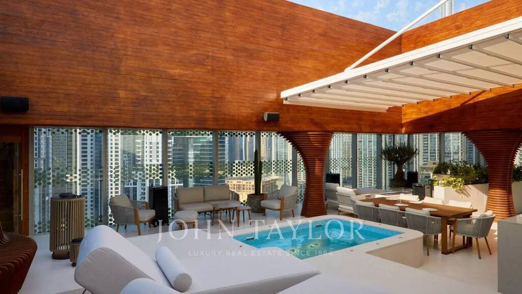 Architektonisches Meisterwerk: Der Opus Tower wurde vollständig von Zaha Hadid entworfen und zeichnet sich durch eine unverwechselbare Würfelform mit einer fließenden Leere in der Mitte aus, die ein markantes optisches Wahrzeichen in der Skyline von Dubai bildet. Geräumiger Triplex-Grundriss: Dieses weitläufige Triplex erstreckt sich über 563,98 m² auf drei Ebenen und bietet reichlich Platz für komfortables Wohnen und Unterhaltung. Drei En-Suite-Schlafzimmer: Jedes Schlafzimmer ist mit einem eigenen Bad ausgestattet und bietet Privatsphäre und Luxus. Zeitgenössisches Interieur: Vollständig eingerichtet mit exklusiven, von Zaha Hadid ausgewählten Möbeln und Einrichtungsgegenständen, die eine nahtlose Verbindung von Form und Funktion widerspiegeln. Vollständig ausgestattete Küche: Eine moderne Chefküche mit hochwertigen Geräten erfüllt alle Ihre kulinarischen Bedürfnisse. Intelligente Haustechnik: Integrierte Smart-Home-Systeme ermöglichen eine mühelose Steuerung von Beleuchtung, Klima und Sicherheit. Panoramablick: Genießen Sie den atemberaubenden Blick auf den Burj Khalifa und das dynamische Stadtbild durch die raumhohen Fenster. Private Terrasse mit Pool und Essbereich: Betreten Sie Ihre weitläufige Terrasse mit privatem Pool und Essbereich im Freien mit spektakulärem Blick auf den Burj Khalifa - perfekt für Entspannung und Unterhaltung. Exklusive Annehmlichkeiten: Die Bewohner haben Zugang zu einem Dachgarten, einem temperaturgeregelten Swimmingpool, einem hochmodernen Fitnesscenter und erstklassigen Spa-Einrichtungen. Erstklassige Lage: Im prestigeträchtigen Burj Khalifa District gelegen, bietet The Opus einfachen Zugang zu feinen Restaurants, hochwertigen Geschäften und lebhaften kulturellen Attraktionen. Eigene Parkplätze: Das Gebäude verfügt über sichere Tiefgaragenplätze für die Bewohner.