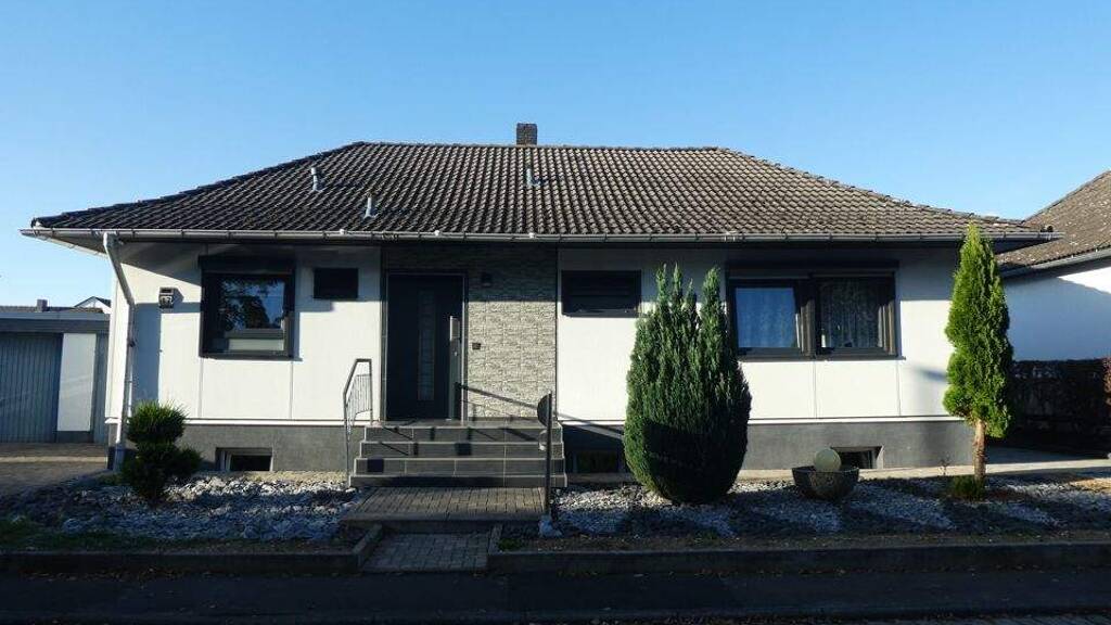 Dieser OKAL-Bungalow befindet sich in familienfreundlicher und beliebter Lage. Beim Betreten empfängt Sie eine einladende Diele, von der aus alle Räumlichkeiten bequem erreichbar sind. Das Herzstück bildet der großzügige Wohn- und Essbereich, der mit einem modernen Kamin, einer großen Fensterfront sowie dem direkten Zugang auf die weitläufige, überdachte Terrasse beeindruckt. Hier genießen Sie einen schönen Blick in den angelegten, sehr großen Garten, der zudem über einen praktischen Gartenschuppen mit integrierter Werkstatt verfügt. Die separate Küche bietet ausreichend Platz und eine ideale Raumaufteilung für Hobbyköche. Zwei geräumige Schlafzimmer sorgen für Rückzugsmöglichkeiten, während das erneuerte Tageslichtbad mit ebenerdiger Dusche sowie das sanierte Gäste-WC modernen Wohnkomfort gewährleisten. Das Haus ist vollunterkellert und überzeugt hier mit einer vielseitigen Nutzbarkeit: Neben einem zu Wohnzwecken ausgebauten Bereich mit zusätzlichem Schlafzimmer steht Ihnen ein weiteres Badezimmer mit einer Dusche zur Verfügung. Ergänzt wird die Ebene durch einen Hauswirtschaftsraum sowie großzügige Abstellflächen. Eine Doppelgarage sowie zwei Außenstellplätze sorgen für bequemes und sicheres Parken. Die umfassenden Modernisierungen - darunter neue Heizkörper, Böden und Wände, moderne Fenster aus dem Jahr 2024 sowie die elegante Fensterfront im Wohnbereich - runden dieses attraktive Angebot ab.