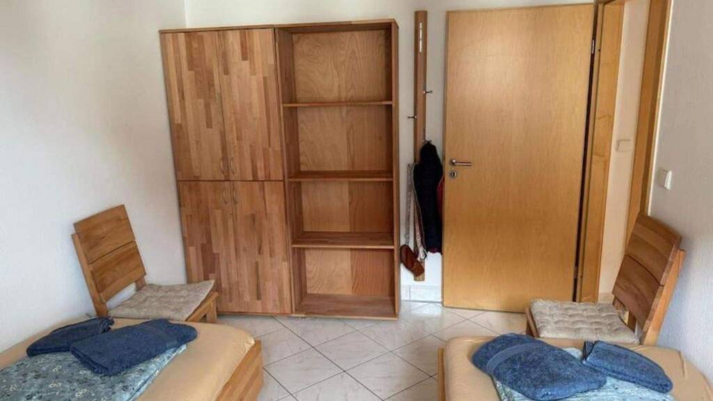 Das zweite Schlafzimmer verfügt über zwei Einzelbetten (je 0,9 m x 2,0 m), die mit allergikerfreundlichen Schaumstoffmatratzen und -kissen ausgestattet sind. Der manuell verstellbare Lattenrost sorgt für zusätzlichen Komfort. Ein Nachttisch mit Lampe, Regalschrank und eine Garderobenleiste bieten praktischen Stauraum. Auf Wunsch kann dieses Zimmer auch als Arbeitszimmer eingerichtet werden, ideal für Ihre beruflichen Bedürfnisse.