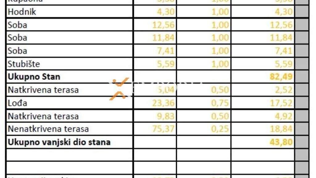Es handelt sich um eine Wohnung im 2. Stock des Gebäudes. Die Raumaufteilung besteht aus einem Flur, zwei Bädern, drei Schlafzimmern, einer Küche mit Esszimmer und Wohnzimmer, einer Loggia und zwei überdachten Terrassen. Von der Wohnung führt eine Treppe auf eine eigene Dachterrasse mit einer Fläche von 75,37 m2. Die Nettonutzfläche der beschriebenen Räumlichkeiten beträgt 126,29 m2.