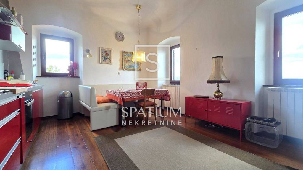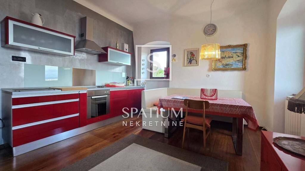 POBRI, nur wenige Autominuten vom Zentrum von Opatija entfernt, bietet eine ca. 80 m² große Wohnung zur Langzeitmiete mit herrlichem Blick auf die Kvarner Bucht. Vom Innenhof gelangt man in einen Raum mit Kamin, der sich ideal als gemütliches Wohnzimmer eignet. Über eine Innentreppe erreicht man den ersten Stock mit Flur, zwei geräumigen Schlafzimmern, einem Badezimmer und einer Wohnküche. Der erhaltene und renovierte Holzboden aus Teak und Buche stammt aus der Bauzeit des Hauses und verleiht ihm eine besondere Atmosphäre. Heizung und Warmwasser werden zentral mit Heizöl erzeugt. Auf der Nordseite des Hauses befinden sich ein Innenhof und ein Parkplatz. Ein Spazierweg durch die schöne Natur führt zur Carmen-Sylva-Promenade.