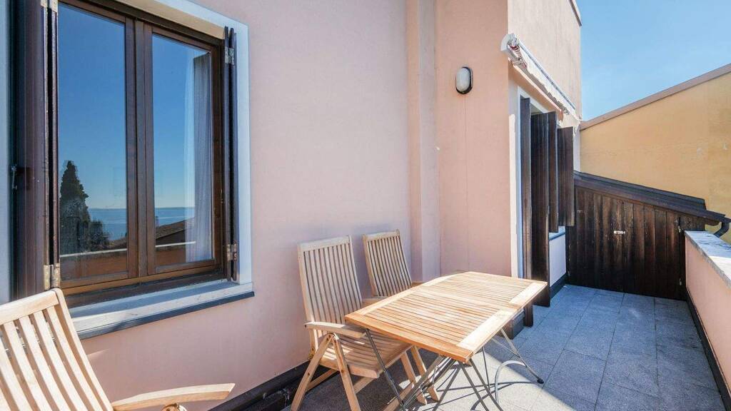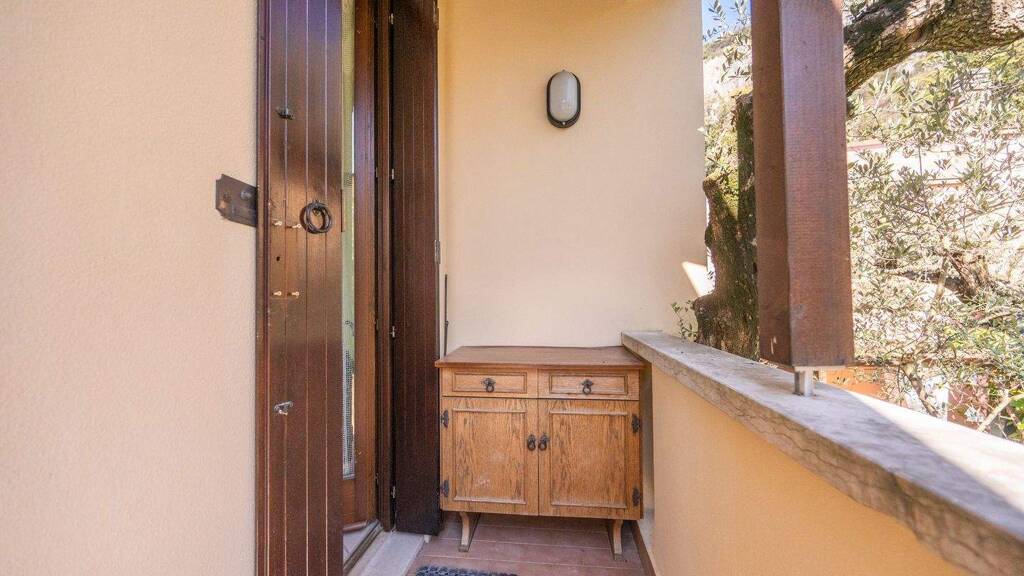 Die Wohnung öffnet sich zu einem hellen Wohnzimmer mit Kochnische, einem gemütlichen und funktionalen Raum, von dem aus man direkt auf eine herrliche private Terrasse mit Seeblick gelangt, die sich perfekt für entspannte Momente im Freien oder Abendessen bei Sonnenuntergang eignet. Der Schlafbereich besteht aus zwei Schlafzimmern und einem Badezimmer mit Fenster.