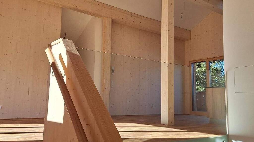 Das neue Dachgeschoss wurde komplett in Massivholzbauweise errichtet, wofür insgesamt über 100 Kubikmeter heimisches Lärchen- und Fichtenholz zum Einsatz kamen. Die drei Wohneinheiten werden künftig über eine energieeffiziente Luftwärmepumpe beheizt, zudem wurden Dämmung und Gebäudetechnik umfassend modernisiert.