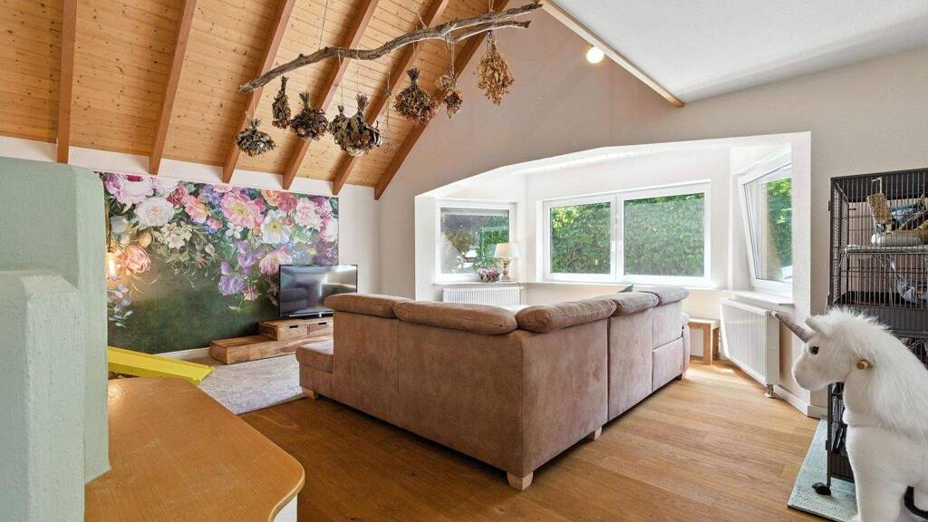 Ein besonderes Plus: der angrenzende Wintergarten mit Schwedenofen. Hier genießen Sie das ganze Jahr über eine wohnliche Atmosphäre mit herrlichem Blick in den Garten. Die angrenzende Terrasse sowie der gepflegte, umlaufende Garten laden zum Entspannen im Freien ein.