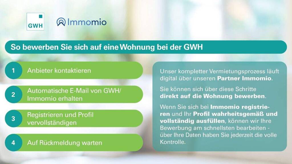 Bitte sehen Sie aus datenschutzrechtlichen GrĂĽnden davon ab, uns Unterlagen per Post oder E-Mail zukommen zu lassen. Unser Bewerbungs- und Vermietungsprozess erfolgt ausschlieĂźlich ĂĽber Immomio.