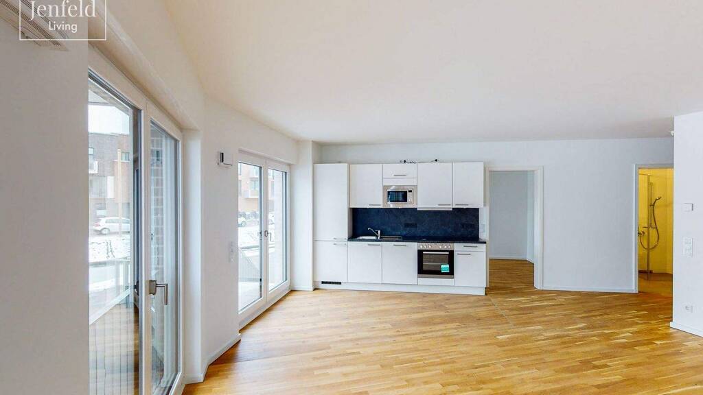In den Wohnbereichen und Fluren gehen glattweiße Wände mit dem Echtholzparkett eine stilvolle Verbindung ein. Die Küchen sind mit Designvinylboden in Eichenoptik ausgestattet, um eine perfekte Kombination zu bilden. Eine über Fernwärme betriebene Fußbodenheizung sorgt im Winter für wohlige Wärme - und im Sommer mittels Wärmeabführung für angenehm kühle Räume. Die Bäder und WCs erfreuen dank großformatiger Fliesen und moderner Einbauten mit einem puristisch edlen Look. Und natürlich ist jede Wohnung bereits mit einer schicken Einbauküche versehen.