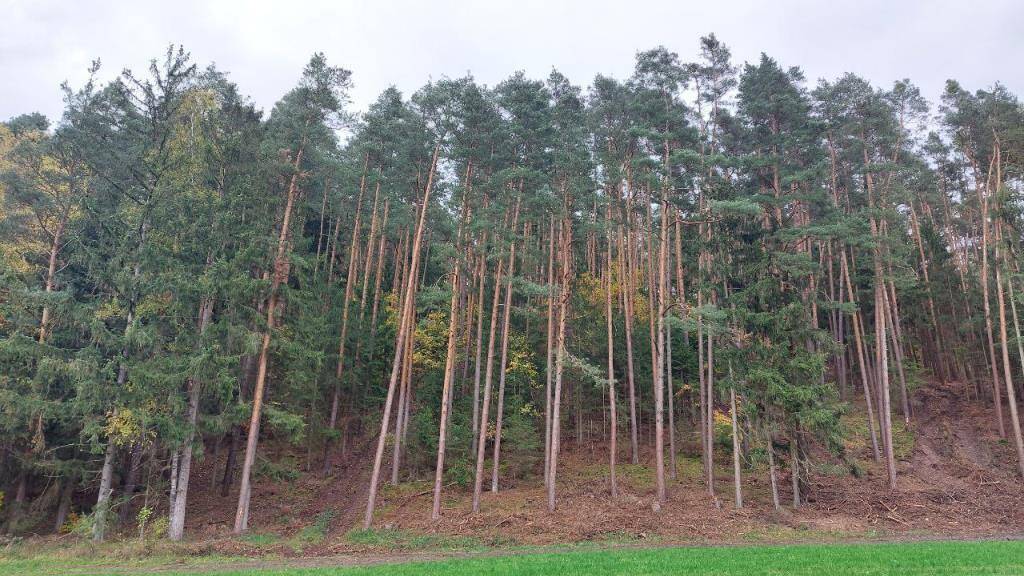 Überwiegend Kiefer, beigemischt Fichte, Lärche. Naturverjüngung mit Laubholz im Unterbau.
