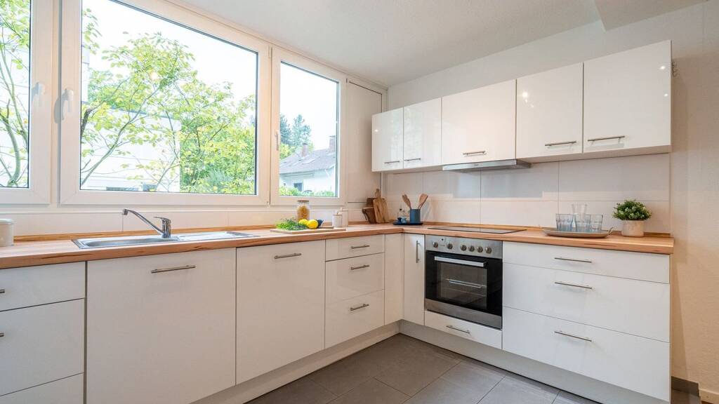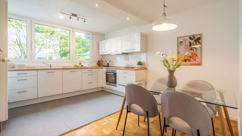 Am Flurende neben dem Wohnzimmer befindet sich die Küche mit Essecke. Die U-Einbauküche mit breiter Fensterfront ist in modernem Glanzweiß gehalten. Viel Stauraum und Arbeitsfläche sowie Edelstahlgeräte runden den offenen Schnitt ab, der von den grauen Bodenfliesen direkt zum Holzboden der Essecke übergeht.