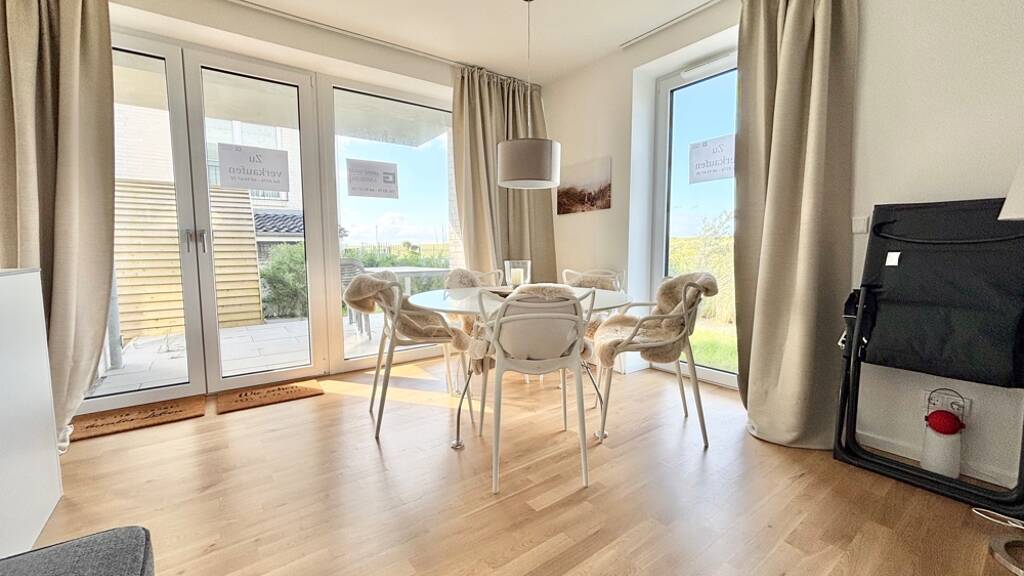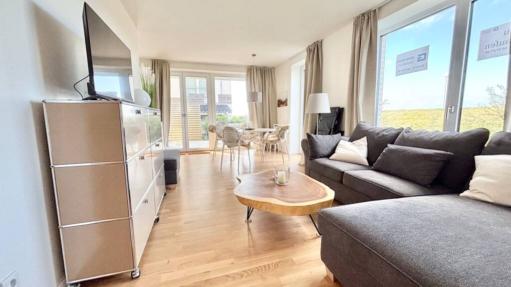 Die Wohnung wird komplett ausgestattet verkauft, somit kann die Ferienvermietung sofort erfolgen. Auch das feste Wohnen ist möglich. Es befindet sich ein großes Doppelbett im Hauptschlafzimmer. Das zweite Zimmer ist mit einem Etagenbett ausgestattet, das eine weitere Schlafmöglichkeit bereit hält. Somit ist diese Wohnung perfekt für Familien mit Kindern geeignet. Im Wohn- und Esszimmer steht die gemütliche Couch sowie ein großer Esstisch inkl. Stühle. Ein Fernseher darf hier ebenso nicht fehlen. Die offene Küche rundet den Wohn- und Essbereich perfekt ab. Die Küche hält keine Wünsche offen. Vom Backofen, Geschirrspüler, über Toaster, Wasserkocher bis hin zum Geschirr ist an alles gedacht. Das Badezimmer hält die Waschmaschine und den Trockner bereit. Handtücher, Bettzeug etc. sind natürlich vorhanden.