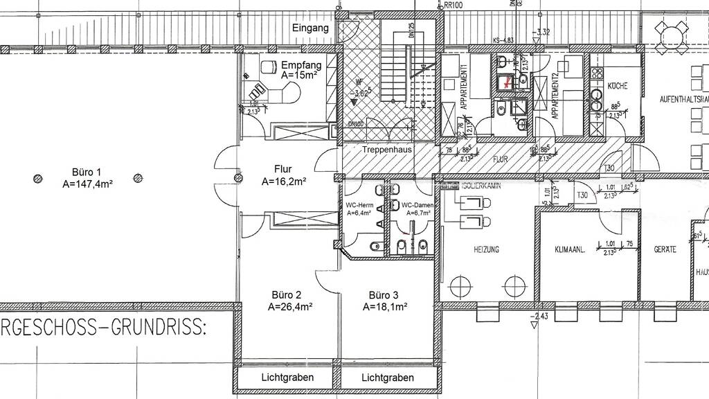 Im Souterrain befinden sich die zu mietende Gewerbefläche, welche neben Büro/Lagerräumen, Sanitären Einrichtungen sogar einen Wintergarten, eine Einbauküche sowie zwei kleine Apartments inkl. Bäder beinhaltet.