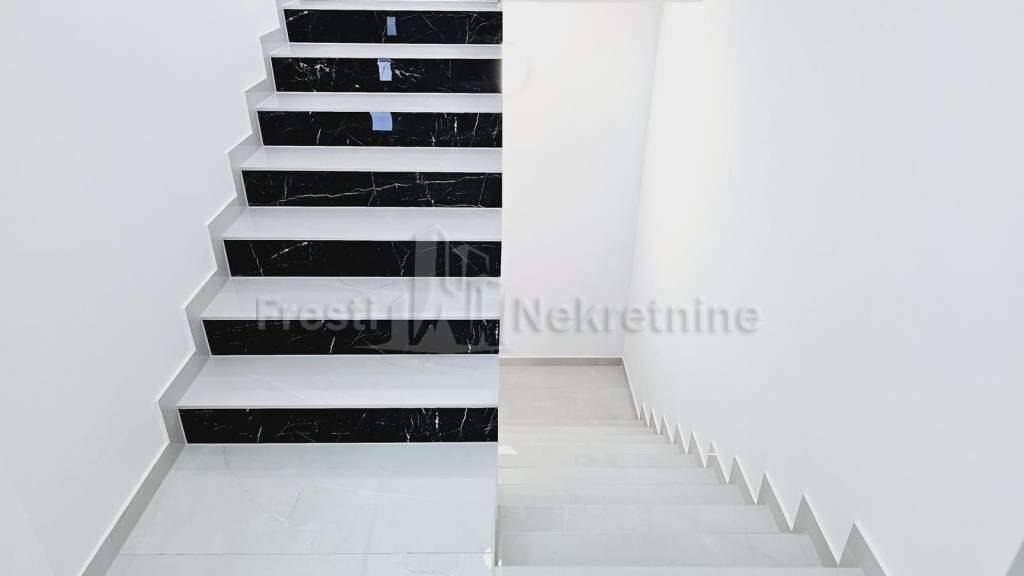 Ova elegantna i prostrana kuca prostire se na tri etaze: U prizemlju se nalazi prostrani dnevni boravak s otvorenom kuhinjom i blagovaonicom, kupaonica, ostava i natkrivena terasa.