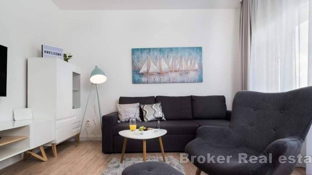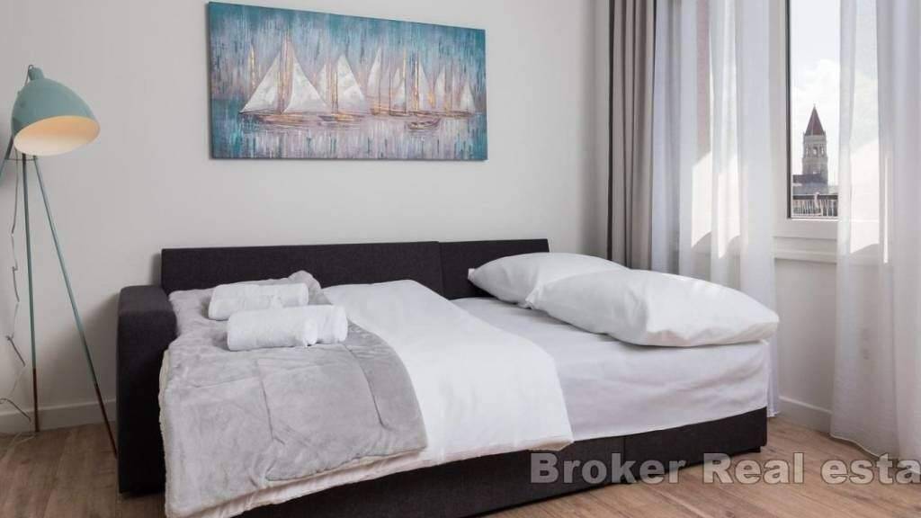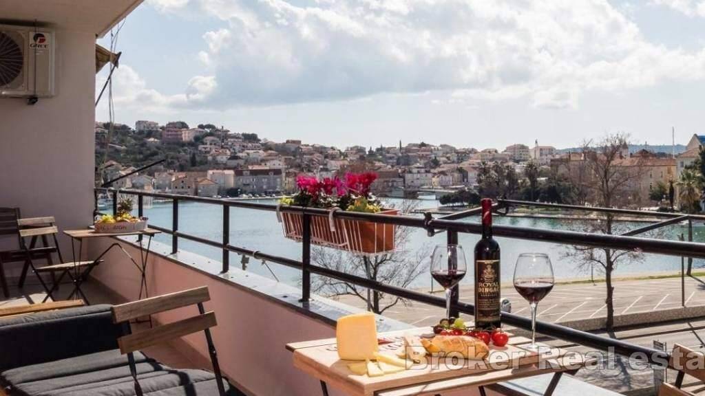 Eine schöne, voll möblierte Wohnung in erster Reihe zum Meer bietet einen spektakulären Blick auf das Meer und die bezaubernde Stadt Trogir. Mit einer Wohnfläche von 63 m war es ursprünglich eine Wohnung mit zwei Schlafzimmern, wurde aber sorgfältig in eine geräumige Einheit mit einem Schlafzimmer umgewandelt und ist somit ideal für touristische Zwecke. Die Wohnung wurde elegant und vollständig renoviert und strahlt durch ihr anspruchsvolles Design modernen Luxus aus.