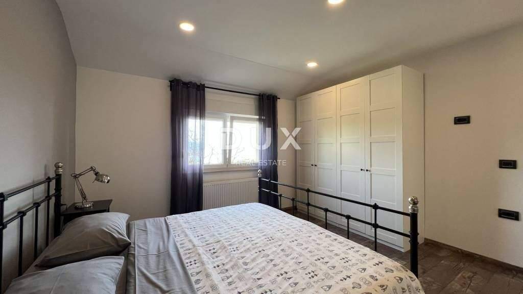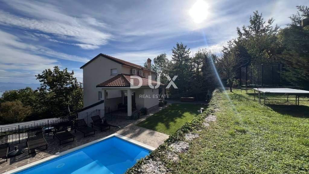 Oberhalb von Lovran, einer charmanten Küstenstadt mit reicher Geschichte und jahrhundertealter Tourismustradition, benannt nach dem Lorbeer, der in dieser Gegend reichlich wächst, steht eine komplett renovierte Villa mit einer Gesamtfläche von 147 m zur Vermietung. Im Erdgeschoss befinden sich ein offener Wohn- und Essbereich mit Küche sowie ein Gäste-WC. Das Wohnzimmer bietet direkten Zugang zur Terrasse und zum gepflegten Garten mit Pool. Im Obergeschoss befinden sich drei Schlafzimmer, jedes mit eigenem Bad. Alle Räume sind klimatisiert, die Heizung erfolgt zentral über Pellets, und in den Bädern ist Fußbodenheizung installiert. Die Villa ist mit Videoüberwachung und Alarmsystem ausgestattet. Auf dem 850 m großen, angelegten Grundstück befinden sich ein Pool mit Sonnenterrasse und ein überdachter Grillbereich ideal zum Entspannen und geselligen Beisammensein in privater Atmosphäre. Die Immobilie liegt in ruhiger Umgebung mit Meerblick.