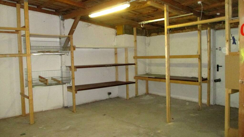 Es besteht aus jeweils einem großen Verkaufsraum im Erdgeschoss und Kellergeschoss, 2 getrennt begehbaren WCs, einer Küche, einem großen Lagerraum und weiterem Stauraum im Keller. Im Hof befindet sich ein überdachter Fahrradabstellbereich für Mitarbeiter.