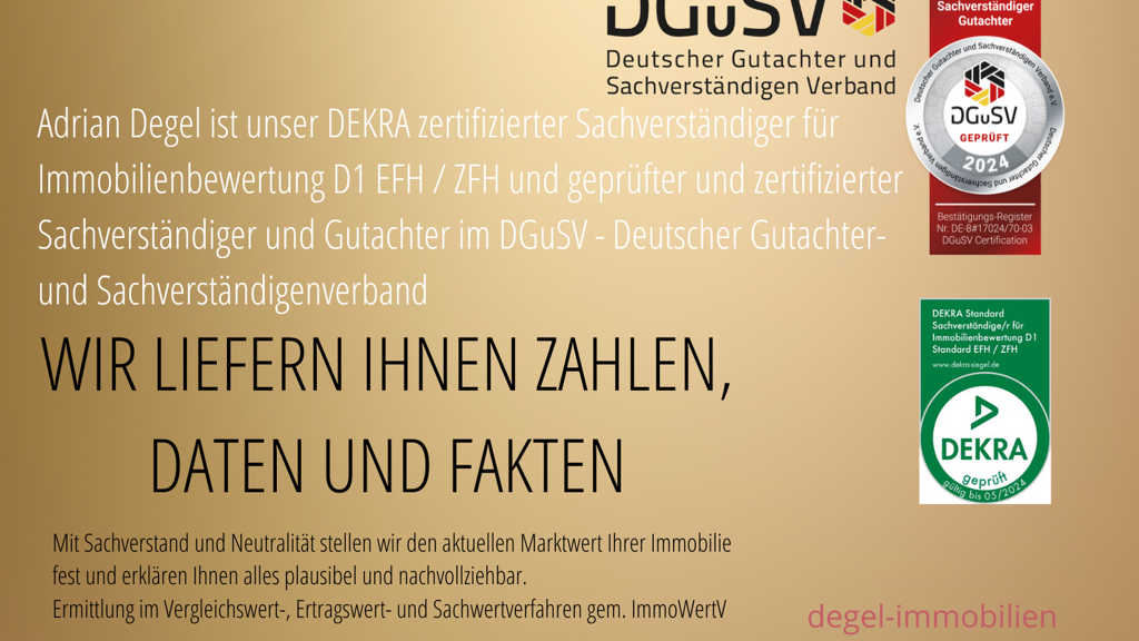 Adrian Degel ist DEKRA- (D1 Plus Standard EFH und ZFH)und DGuSV-zertifizierter Sachverständiger für Immobilienbewertung.