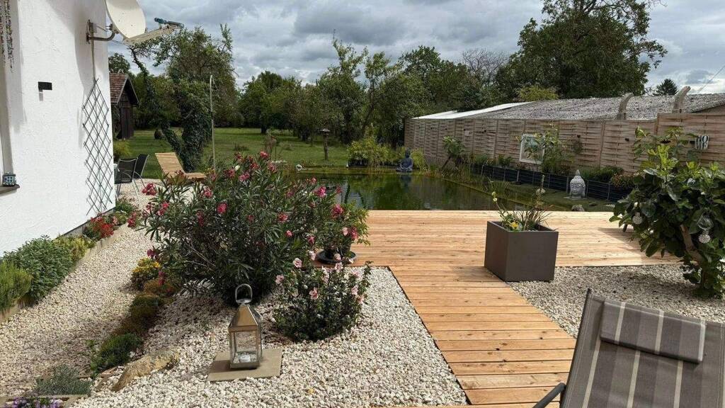 Ein geräumiger Naturschwimmteich mit den Maßen 13 × 7 m. Eine Terrasse am Teich sowie drei weitere Terrassen mit robusten Lärchenholzbelägen. Ein Balkon für entspannte Ausblicke. Der Garten ist komplett umzäunt und absolut blickgeschützt Üppige Bepflanzung mit Obstbäumen, farbenfrohen Stauden und praktischen Hochbeeten. Eine voll eingerichtete Outdoor-Küche. Eine Garage kombiniert mit einer 36 m² großen Werkstatt. Automatische Toreinfahrt mit Kiesbelag und zusätzlicher Schuppen mit reichlich Lagerfläche.