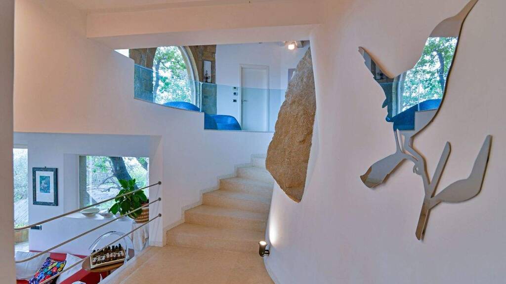 Im zweiten Stock befindet sich der exklusivste Schlafbereich, der ganz der Privatsphäre und Entspannung gewidmet ist. Hier finden wir ein Schlafzimmer mit eigenem Bad und privater Terrasse sowie die Master-Suite, das wahre Prunkstück des Anwesens. Auch diese verfügt über ein eigenes Bad und eine private Terrasse, ist geräumig, hell und mit einem mosaik verzierten Whirlpool im Freien mit Meerblick ausgestattet, der einen Ort absoluter Ruhe und Luxus schafft. Ebenfalls auf der zweiten Ebene, in einem separaten Gebäude, befindet sich ein Abstellraum mit angeschlossenem Badezimmer, der leicht in ein unabhängiges Gästehaus umgewandelt oder als zusätzlicher Privatraum genutzt werden kann, wobei die Harmonie und stilistische Kontinuität der Villa erhalten bleibt.